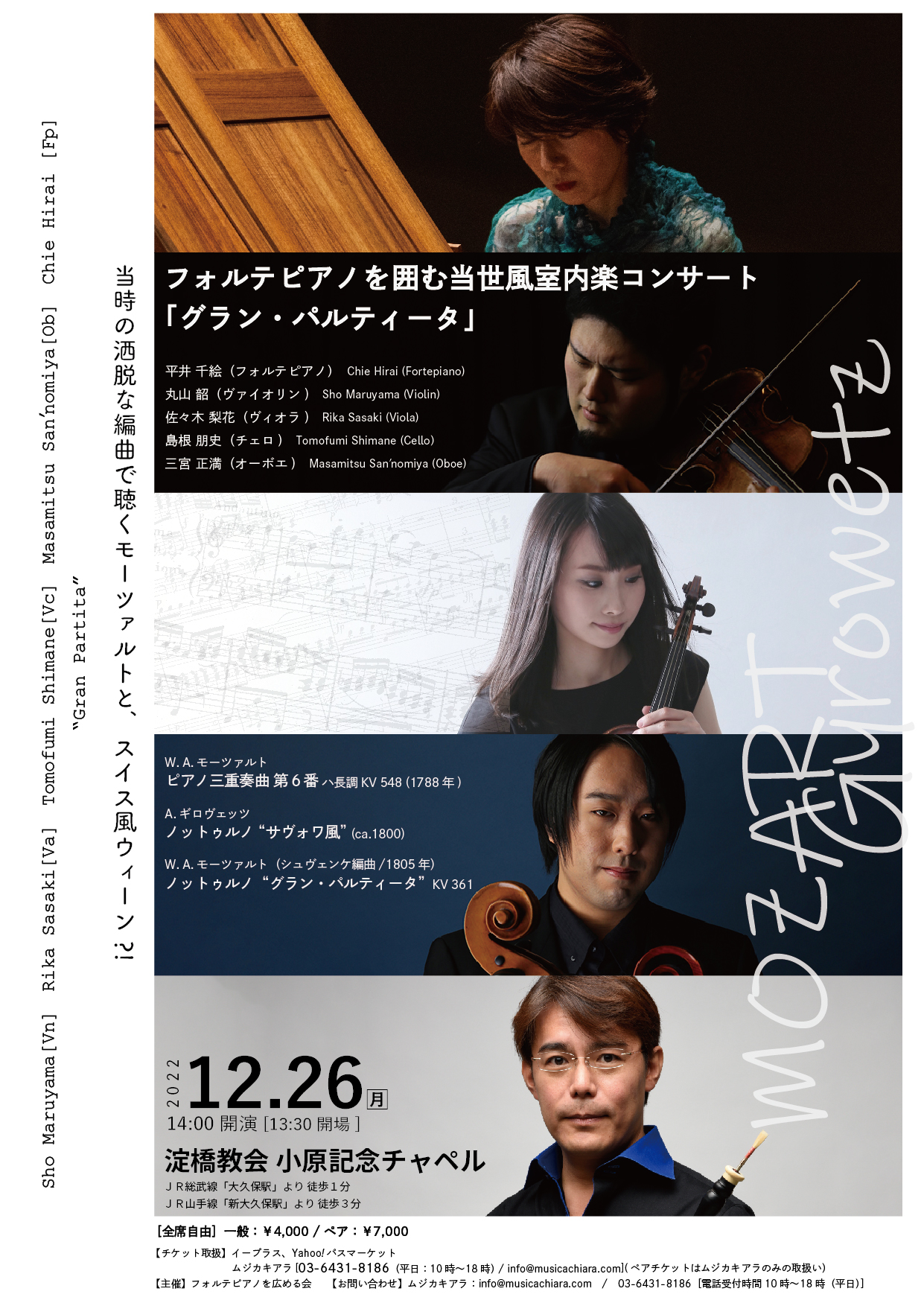 ムジカキアラ info@musicachiara.com Twl.03-6431-8186 受付時間10時~18時(平日)*ペアチケットはムジカキアラのみで取り扱い。